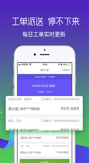 3、微信/APP的移动化,随时随地掌握师傅的工单服务情况,更快的响应服务需求。4、