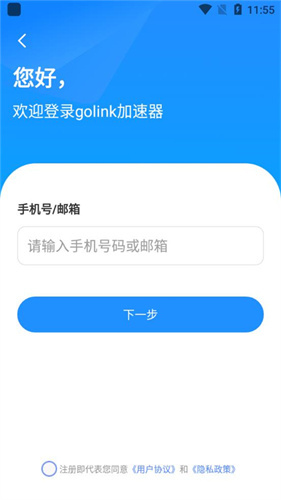 3、第三步,输入手机号码,并勾选用户协议和隐私政策,点击“下一步”。