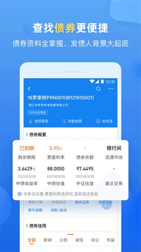 2、展示债券的详情信息,包括债券要素、债券发行、债券评级、债券估值、事件提醒、债券公告、相关证券、机构持仓等内容。