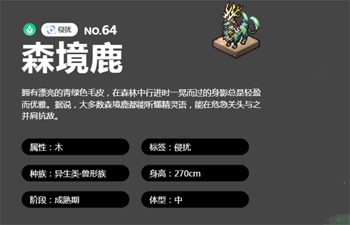 从外形来看确实很吸引人,有青绿色的毛皮,一看就比较亮眼,关键是还可以听懂精灵语。在危急的时刻就可以站在我们的边上,成为我们的左膀右臂,这互动感还是比较出色的。另外还会有清晰的属性,中猪就直接放在一生类的兽形足内,身高是270厘米,属于一个中型体型。目前正处于成熟期阶段,定位还是比较明确的,不过需要注意的是它并没有一个成长路线。所以在培养的时候,重点就是放在属性搭配,还有技能上面那先来看一下技能方面的优势。