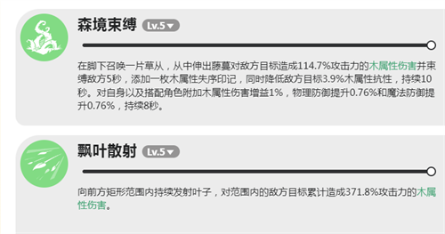 森境束缚在释放的时候就可以直接召唤草丛,藤蔓在缠绕之后就可以给敌方造成114.7%的攻击力。并且还可以束缚对方将近5秒的时间,同时会叠加一个木属性的失序印记,更绝的是就可以降低敌方3.9%的木属性抗性。不过与此同时也会给自己还有我方的队友增加1%的伤害加成,在8秒的时间内还是很有优势性的。飘叶散射这就是一个范围性的伤害利器会朝着前方矩形区域去持续的发射叶子。累击就可以直接打出371.8%的攻击力木属性伤害,在清理小怪或者是打群体boss时真的很好用。