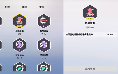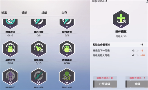 如果玩家选择的是输出或者是防御类型的角色,那就可以优先点满角色的机能属性,这样才能让这些成员在对战的时候更加平衡,这个属性得到提升之后,整体的换弹速度也会变得更快一些,加入万家选择的是守护类型的角色,那就需要去注重这个角色的续航能力,就比如提升角色的技能减速效果,这样才能在战斗的时候轻松抵抗对手的进攻,但关于这些天赋的增加并不是固定的,玩家可以根据实际的需求再次进行调整,这样才能获得一个更加适合自己的角色。