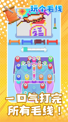 2、简单易上手的操作,玩法规则简单,只需点击对应颜色毛线团收集至工具,同色缠满自动拼入拼图,轻松上手无门槛,适合各年龄段玩家。