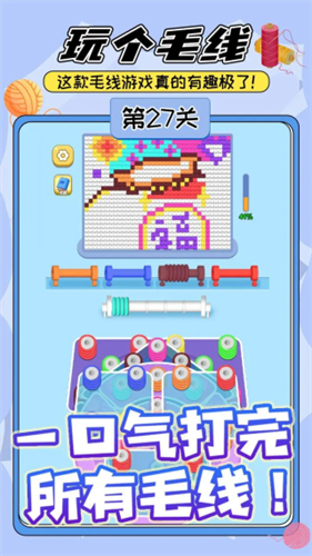 3、同色毛线整理,持续收集同色毛线,当工具上缠满同色毛线后,会自动拼入上方拼图,逐步完成拼图图案。