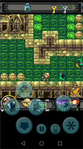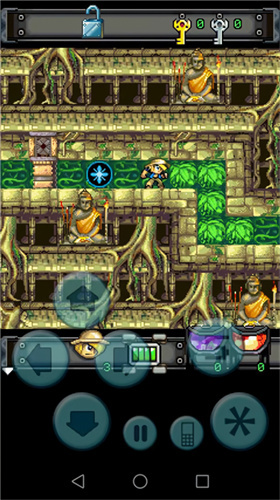 4、第四关:主人公向下吃到一个钻石,并把旁边的岩石向右推,压下地上的机关,从打开的通道出去。向右的地面上也有一个类似的机关,但岩石在只有从右方推动。先不要管,避开毒蛇和喷火器从左边的通道上去。一路上行吃下钻石,踩上检查点。