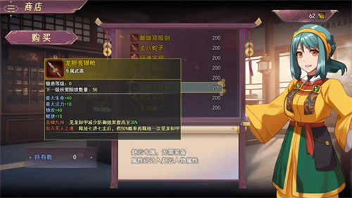 武器:分为剑、长兵器、弓、扇、重兵器,仗,不同武器功能各不相同