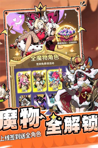 公测上线签到,领全魔物角色!可爱又迷人的反派角色马上带回魔王城!每天不仅送十连,还可随机抽领高额启动资金,十万钻拿完为止!