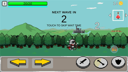 2、操控方式简单直观,左侧按钮控制角色左右移动,右侧按钮对应长剑攻击、弓箭射击与防御动作。指尖轻触间,即可完成闪避、进攻等操作,新手也能快速掌握。