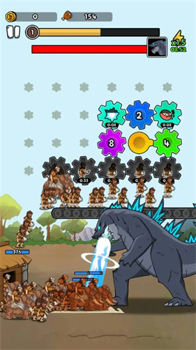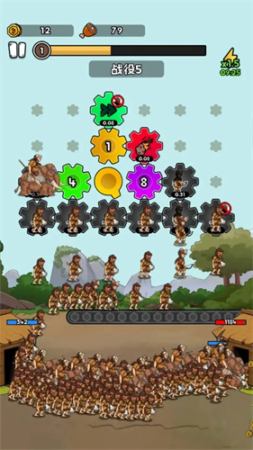 2、游戏的核心玩法围绕齿轮机制和人类进化展开,通过齿轮旋转召唤原始人参与战斗,随着战斗的进行和资源的积累,人类不断进化升级,从原始状态逐步迈向更高级的阶段,阵容实力也随之增强,让玩家体验到从弱小到强大的成长乐趣。