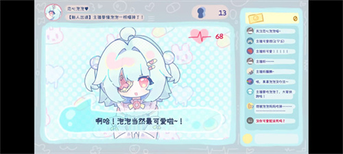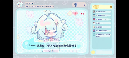 主播要像泡泡一样爆掉了手机版完整版是一款非常好玩的二次元可爱风格的水色系画风的Vtuber模拟游戏,在和直播间观众的聊天时会不断出现选项供玩家选择,选择正确会为直播间带来人气和打赏,但是选择错误可能会失去观众或者被审核封禁直播间。同时也要注意心率,小心像泡泡一样爆掉。需要留住这些观众进行对话选择,尽可能把直播间带火。