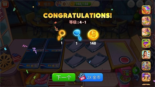 3、关卡系统是游戏的重要组成部分,玩家完成新手玩法后就能进入关卡模式,前期 1-12 关要求在 7 个顾客手中赚取 35 金币 —— 对于无限金币版本来说,这个目标几乎毫无压力,甚至能提前完成。每通关一关点击 “next” 就能进入下一关,当完成一家餐厅的全部关卡后,还能解锁新餐厅继续经营,也可以回头完善之前的餐厅。无限资源让你在解锁新餐厅时,能直接为新餐厅配备顶级厨具和丰富菜品,不用从零开始积累,快速开启新的经营旅程。