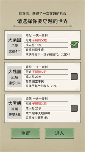 2、沉浸式的家族传承氛围营造极具特色。游戏通过文字细腻描绘家族的每一个发展阶段,从初始寒门的艰难起步,到成为大族后的科举选秀,再到望族的祭祖仪式,每一个节点都伴随专属的事件与玩法。族人的生老病死、婚姻子嗣、仕途沉浮都真实可感,如选错继承人导致断代的遗憾、族人考取状元的喜悦,让玩家仿佛真正成为家族的掌舵人,感受世代传承的厚重感。