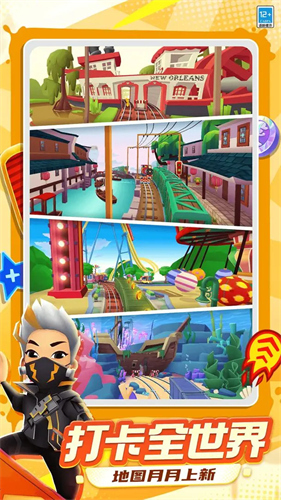 1、核心跑酷操作玩法:通过滑动屏幕实现跳跃、下滑、左右转向等动作,躲避轨道上的列车、路障等障碍物,同时收集沿途金币与道具。内置菜单的无限钥匙可直接复活继续奔跑,无需担心失误中断,新手也能轻松掌握上坡短跳、下坡远跳的技巧,专注享受竞速乐趣。