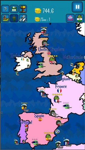 3、画面与细节处理值得肯定,国家球的形象设计独具特色,战斗时的特效与音效诙谐生动,地形地图的还原度也较高。轻量化的操作设计让手游新手能快速上手,而策略维度的保留又能满足核心玩家的布局需求。