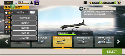 2、游戏每完成一个任务都会得到现金和金块的奖励,这些在飞机库设备升级中具有非常重要的作用,玩家不但能更换更加高端的无人战机,更能对枪械和炮弹进行升级,使它们发挥出更大的威力。战机不同的性能也是可以改善和提高的,它们会进一步提升战机的能力,在任务的执行中发挥出巨大的作用。