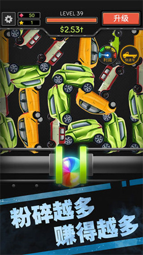 1、游戏目标:通过碾压废旧的汽车所产生的零部件来赚取收益,点击加速会让两侧的碾压机器速度得以增加,从而大大的加快碾压效率,最终获得更多的收益。