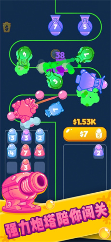 1、前期金币不足,要进行闯关才能获得金币并购买炮塔,并且玩家注意将数字和颜色相同的炮塔进行合成,解锁更加强大的塔防,动动手指,轻松的移动,即可抵御敌人的攻击,完成游戏任务。