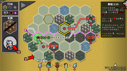 5、当你放置卡牌后点击左上方的黄色三角符号,然后棋盘上的棋子就会按照下方的时间度标顺序自主行动。